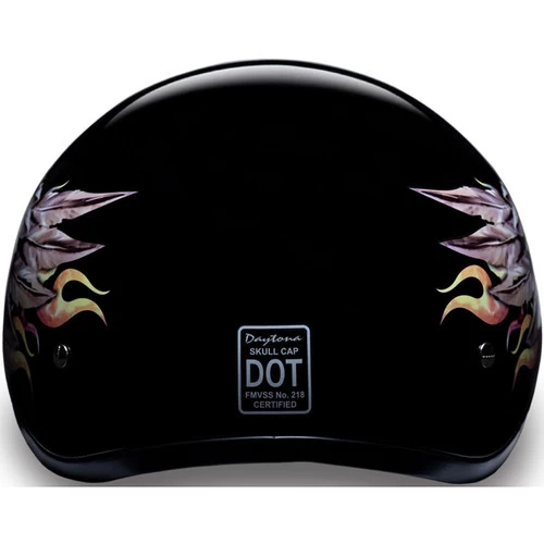 Daytona Slim Line Skull Cap 1/2 Shell Helmet in Skull Wings Graphic. Meets and Exceeds D.O.T. FMVSS 218 standards and is one of the smallest D.O.T. 1/2 Shells in the market! With 3 different shell sizes, you’re sure to get that proporitionate fit! Custom formed interior for X-treme comfort. DOT Approved helmets require at least a 1 inch liner. Many DOT Approved half helmets are between 1-2″ thick. The thickness is commonly measured at the thinnest area, which is the ear area. Depending on the size, the Daytona Skull Cap stays closer to the minimum at 1 – 1 1/4″.
