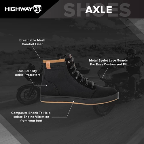 Your bike is part of your everyday life, your gear should be too. The Axle Shoe by Highway 21 â„¢ is a legit riding shoe that thinks it’s an every day sneaker. Reinforced toe & heel boxes, dual ankle protectors, crush resistant sole with composite shank, and topped off with a black textile upper means that it seamlessly slides from riding to living, just like you do.