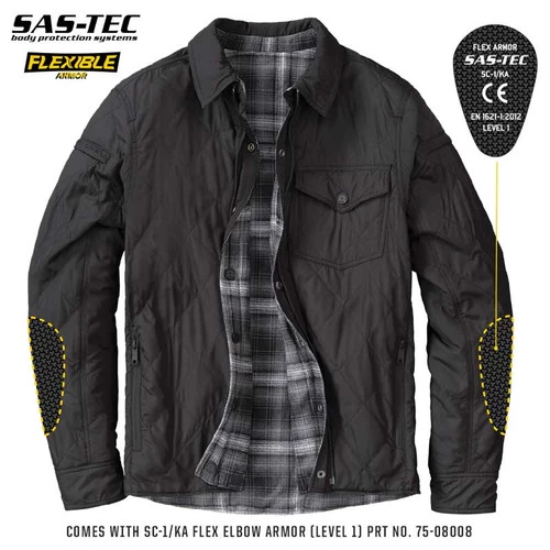 - Sas-tec® CE Level 1 Flex armor included at the elbows with armor pockets at the shoulders for optional armor